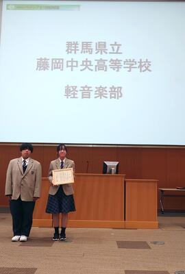 軽音楽部が今年度ベイシア21世紀財団による学校クラブ活動に対する助成金事業の対象団体に選ばれ、10月19日にベイシアビジネスセンターで行われた贈呈式に参加しました。