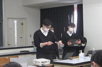 ①クラス内発表会で選ばれた代表班によるプレゼン(クラス内発表会の様子はコチラ笑う)