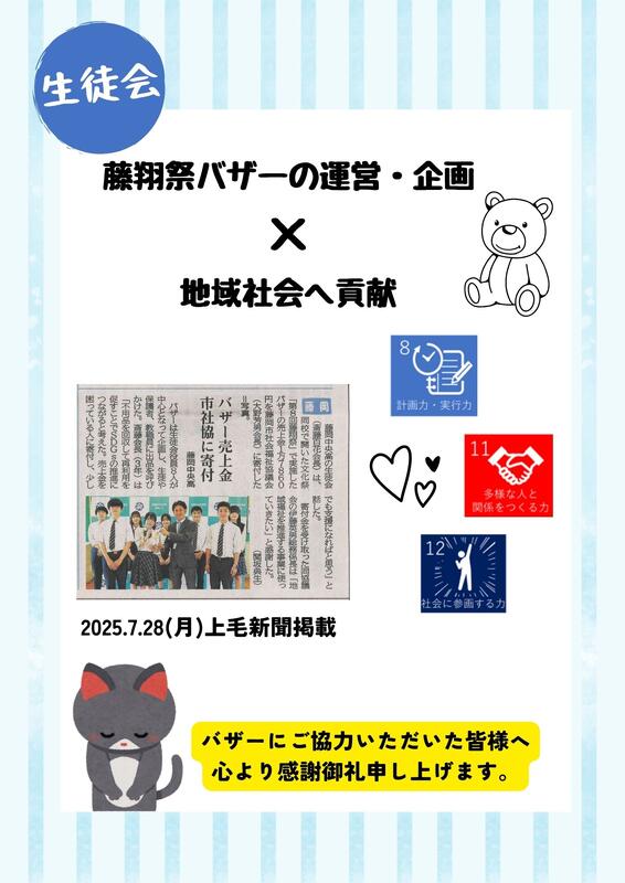 7月に開催された藤翔祭では、生徒会がバザーの企画・運営を行いました。生徒・保護者の皆様、先生方からたくさんの品物を提供していただき、バザーを好評のうちに終えることができました。バザーの収益金は、生徒会が責任を持って藤岡市社会福祉協議会様に寄付させていただきましたことをご報告いたします。ご協力ありがとうございました。