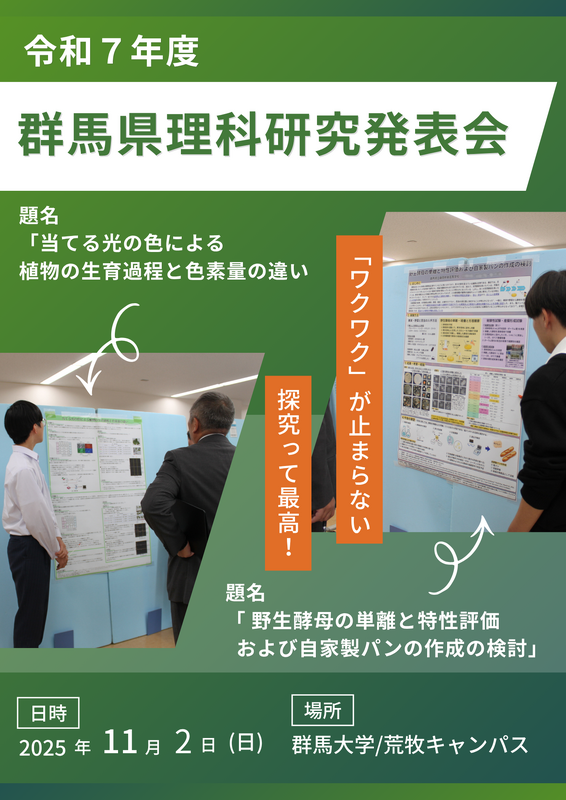 11月2日(日)に群馬大学で行われた群馬県理科研究発表会に2チームが参加しました。ポスター発表では、たくさんの方々からアドバイスや質問をいただき感謝しています。自分たちの研究にフィードバックし、研究をよりよいものにしていきたいと思います。