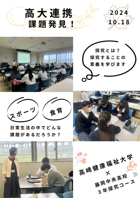 18日(金)、高崎健康福祉大学の木村教授を講師に迎えて「探究することの意義」について講義を行いました。今回は「スポーツ」と「食育」に着目して課題を見つけ、その課題解決のための思考を深めました。身近な話題ということもあり、生徒同士で楽しみながら活発な意見交換ができていました。