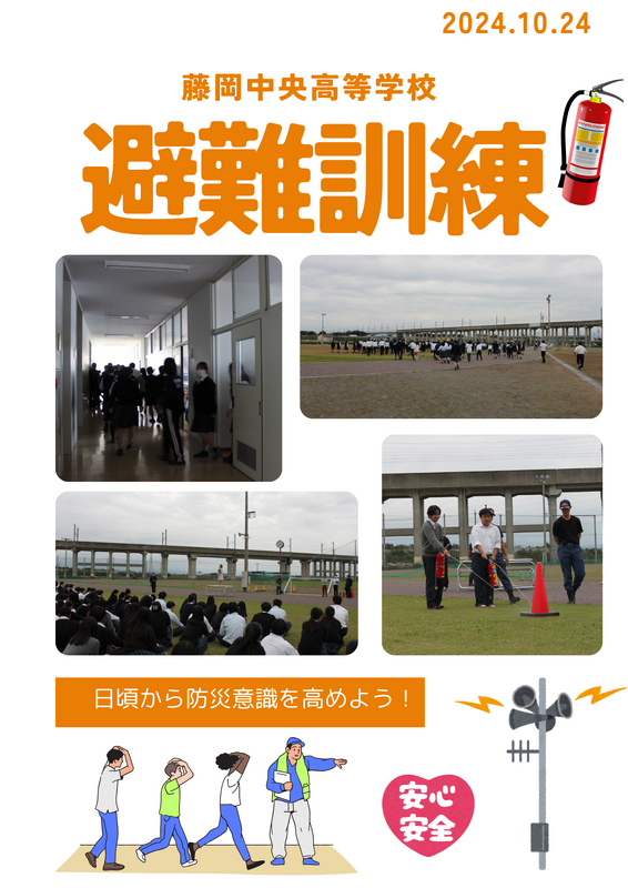 24日(木)に第二回避難訓練を行いました。今回は地震発生後の火災を想定した訓練でした。避難指示に従い、災害リスクを想定した行動や避難経路の確認を行いました。また、消防署の方から消火器の使い方を教えていただいたり、防火委員の代表生徒が水消火器を使った消火訓練を体験したりしました。
