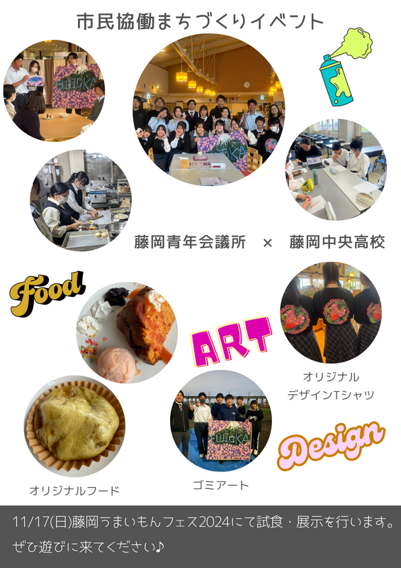 まちづくりイベントに参加していた藤中の生徒が、AIが作成したオリジナルデザインの藤岡Tシャツを着用しながら、藤中周辺のゴミで作ったアート作品の展示や藤岡産のトマトと豚肉を使ったオリジナル料理の試食会などで参加します!みなさんも藤岡を盛り上げるためにぜひイベントに来てください!!