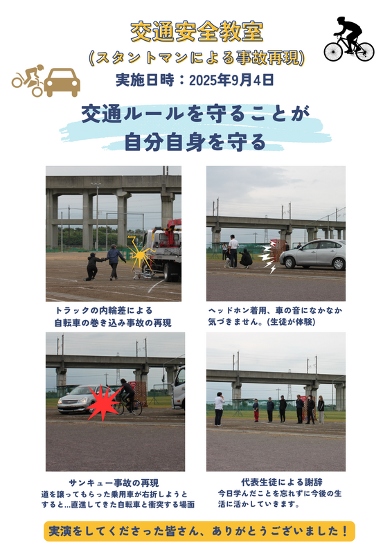 4日に交通安全教室を実施しました。スタントマンの方々が実際に起こりやすい交通事故の状況を再現し、生徒たちはその様子を目の前で体感することができました。事故の衝撃や恐ろしさ、危険性を実感するとともに「交通事故はいつ起こるかわからない」「もしかしたら自分にふりかかるかもしれない」と自分のこととして捉えることができたのではないでしょうか。一人一人が交通ルールを守り、危険を予測して注意深く行動することが大切です。併せて藤岡中央高校では自転車通学者全員のヘルメット着用をお願いしています。ご家庭でも「安全な登下校」「命を守ること」などについてお子様と話し合ってみてください