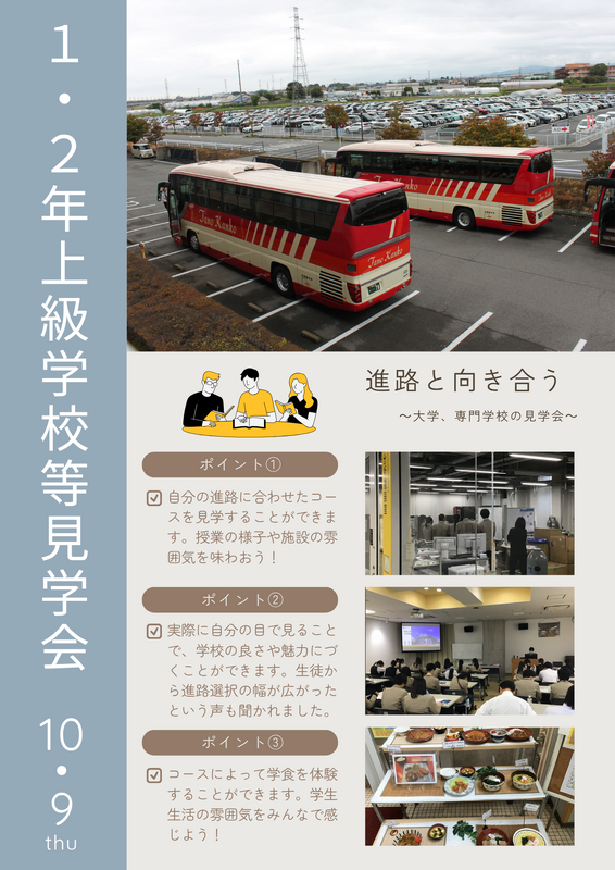 9日(木)は、1・2年生が学年ごとに4つのグループに分かれて大学や専門学校を見学する上級学校等見学会が行われました。施設見学やキャンパスの雰囲気など、学生生活を身近に感じることができたようです。ある生徒は「今まで県外の大学を志望していましたが、今回見学した学校の雰囲気がとても良かったので選択肢の一つとして考えていきたいと思いました。進路選択の幅が広がったので見学に行って良かったです。」と話してくれました。