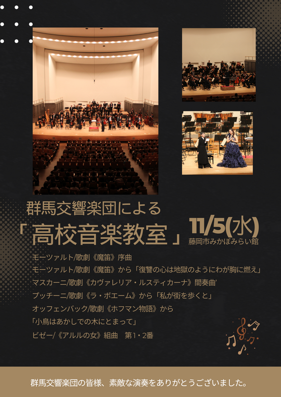 11月5日(水)はみかぼみらい館で群馬交響楽団による「高校音楽教室」が開催されました。指揮は田中祐子さん、ソリストは富永果捺子さんでした。コロラトゥーラ・ソプラノの歌声と美しい演奏が全校生徒の心に響きました。