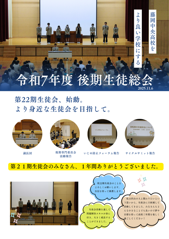 11月6日(木)は生徒総会が第一体育館にて行われました。第21期生徒会より、第22期生徒会へバトンが渡されました。本部役員の8名のみなさん、1年間どうぞよろしくお願いします。