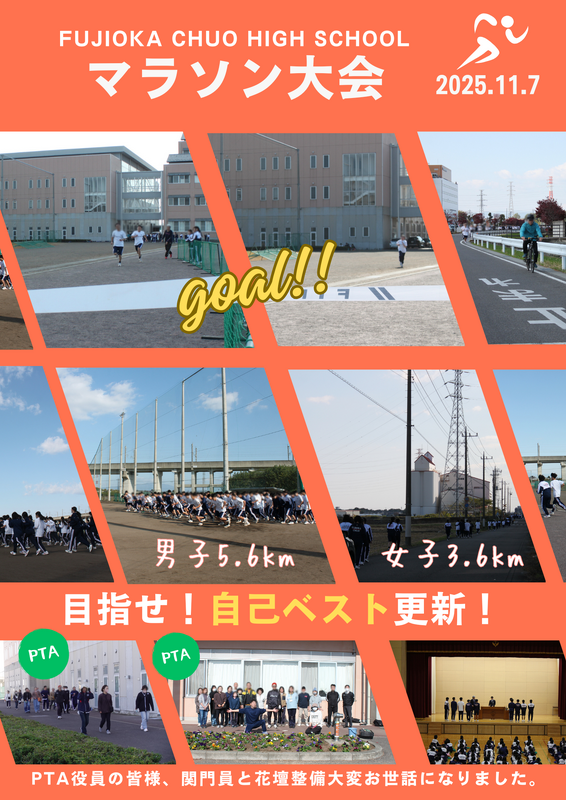 11月7日(金)は校内マラソン大会が行われました。晴天に恵まれ、マラソン日和となりました。男子5.6㎞、女子3.6㎞のコースを走ります。優勝は男女ともに3年生でした最上級生として藤中を引っ張る姿はとても頼もしく、素晴らしい走りを見せてくれました。どの生徒も諦めずに最後まで走り切ることができました。みなさんお疲れ様でした!学校医の星野先生、PTA役員の皆様、お忙しい中大変お世話になりました